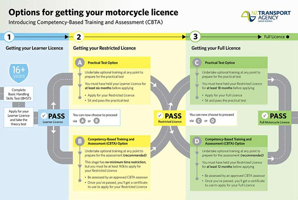 CBTA is a new training and assessment option for people getting their motorcycle licence. Instead of taking a practical test at each stage of your licence, you can choose to have your riding skills assessed by an approved CBTA assessor. Although training isn't compulsory, we recommend you complete training before attempting the assessment ride.